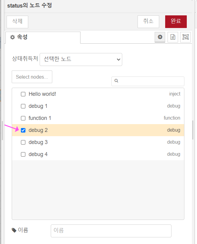 예시) 예를 들어 아래와 같은 플로우가 구성되어 있을 때, debug2로 메시지(숫자'2')가 전달 되는 상황에서 Debug2로 메시지가 전달되면 "status 노드"를 통해서 이를 확인하는 플로우를 구성할 수 있습니다.