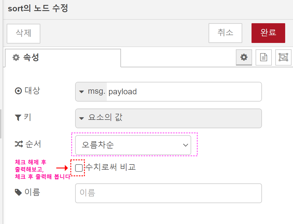 Sort노드는 아래처럼 입력하는데, 먼저 "수치로써 비교" 부분을 체크해제하고 결과를 출력해본 후, 체크 후 결과도 차례로 출력해 보세요.