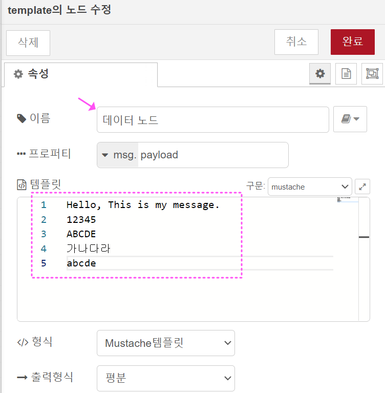 템플릿(Template) 노드의 데이터 설정은 아래처럼 했습니다.