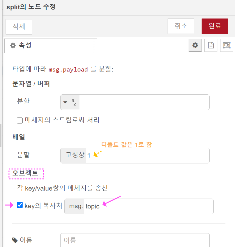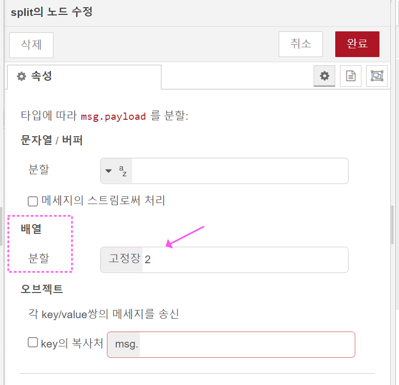 그리고 Split노드의 속성은 아래처럼 구분해 주세요. 먼저 2로 입력하여 배열의 값을 두 개씩 묶는 경우입니다.
