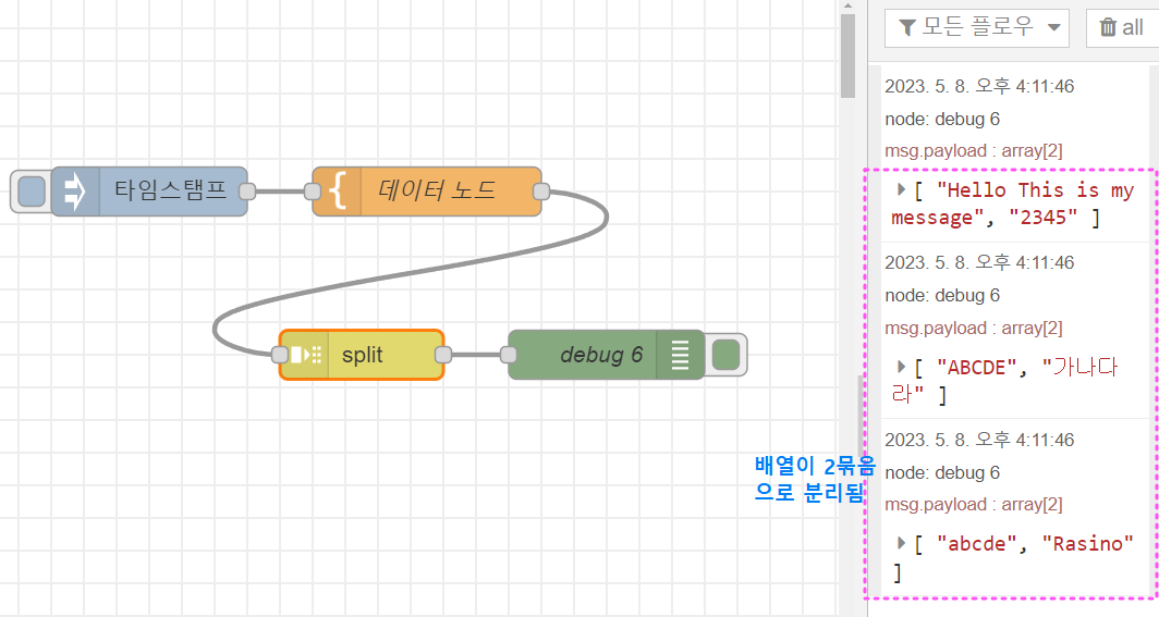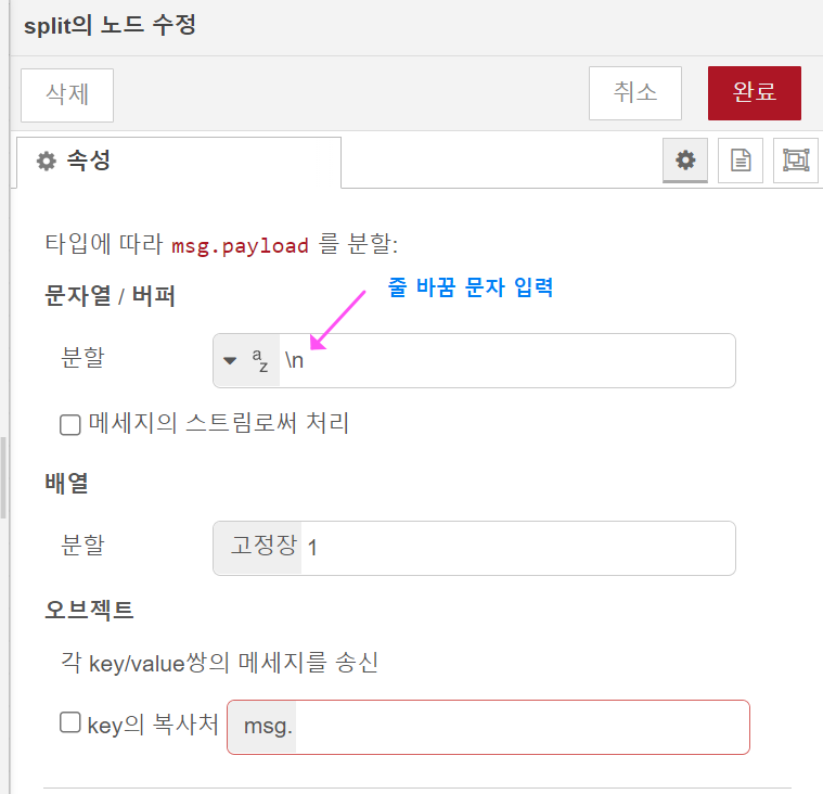그럼, 예시로 split노드를 이용해서 전달할 메시지를 줄바뀜이 날 때마다 분리해 볼게요.