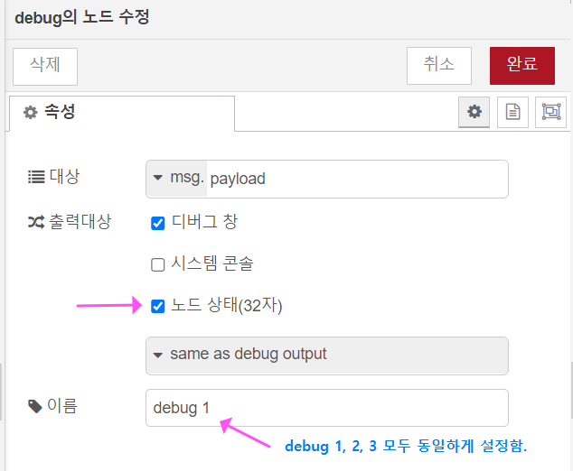 우선, 위와 같이 노드 플로우를 구성하고, Status의 설정과 디버그 1, 2, 3, 4의 설정은 아래와 같이 해주세요.