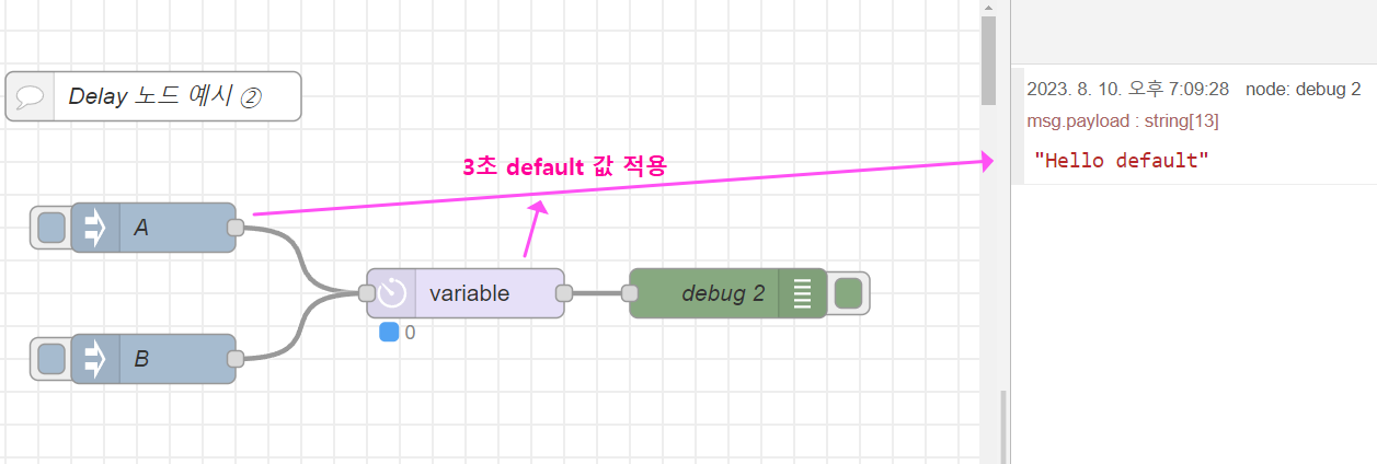 5. 결과를 실행해 보면, 'A inject'노드를 눌렀을 때, delay (variable) 노드에 기본 값으로 설정된 3초를 기다린 후 A의 메시지(페이로드)를 debug 창으로 전달(출력)했으며,