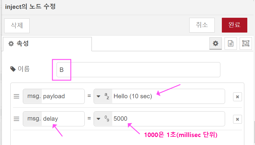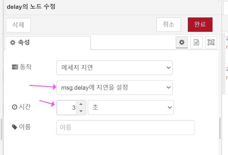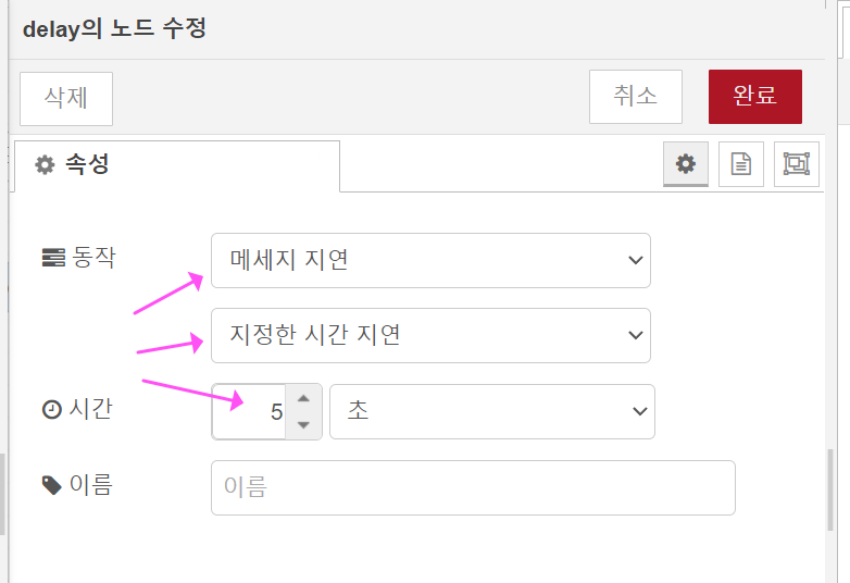 2. delay 노드의 속성은 아래처럼 해주세요.