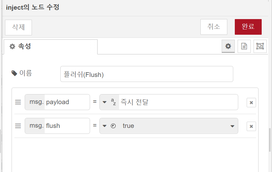 8. 아래처럼, 플러쉬(Flush) inject 노드를 추가해 주는데요, 마찬가지로 일반 inject 노드를 추가해서 두 번째 줄에 있는 msg.topic 항목의 topic 글자를 지우고 flush를 입력합니다. 그리고 속성창에 있는 속성을 Boolean(불린)으로 변경하고, true값으로 설정확인해 주면 됩니다. Flush 기능은 delay 타임이 적용되고 있든 그렇지 않든 클릭하는 즉시 페이로드를 전달시키는 기능입니다.