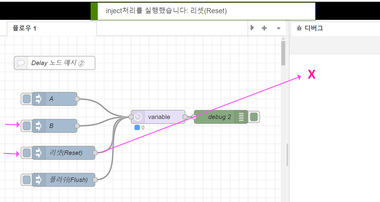 실습은 먼저 A 혹은 B inject 노드(여기서는 5초로 설정된 B 노드를 클릭)를 클릭 한 다음 5초가 되기 전 Reset inject노드를 클릭하면 delay가 취소되고 debug창으로 아무런 페이로드가 전달되지 않는 것을 볼 수 있습니다.