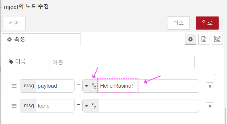 1. 타임스템프(inject 노드)의 속성 값으로 전달할 적당한 메시지를 아래처럼 작성합니다.