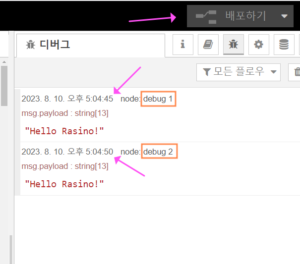 3. 그리고 배포하기를 누르고 Inject 버튼을 누르면 아래처럼 debug 창으로 결과를 확인해 보면, delay가 없는 출력과 비교해서 5초의 설정에 따라 5초의 delay가 정확히 발생하는 것을 알 수 있습니다.
