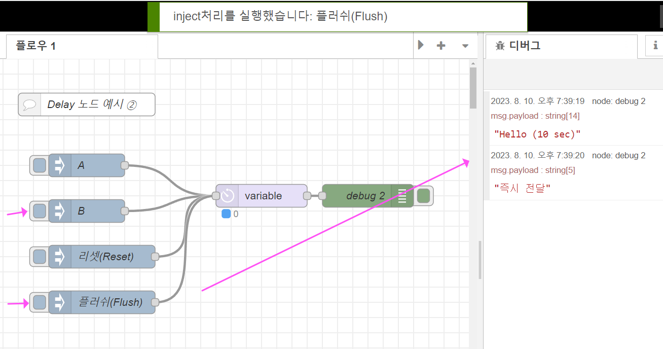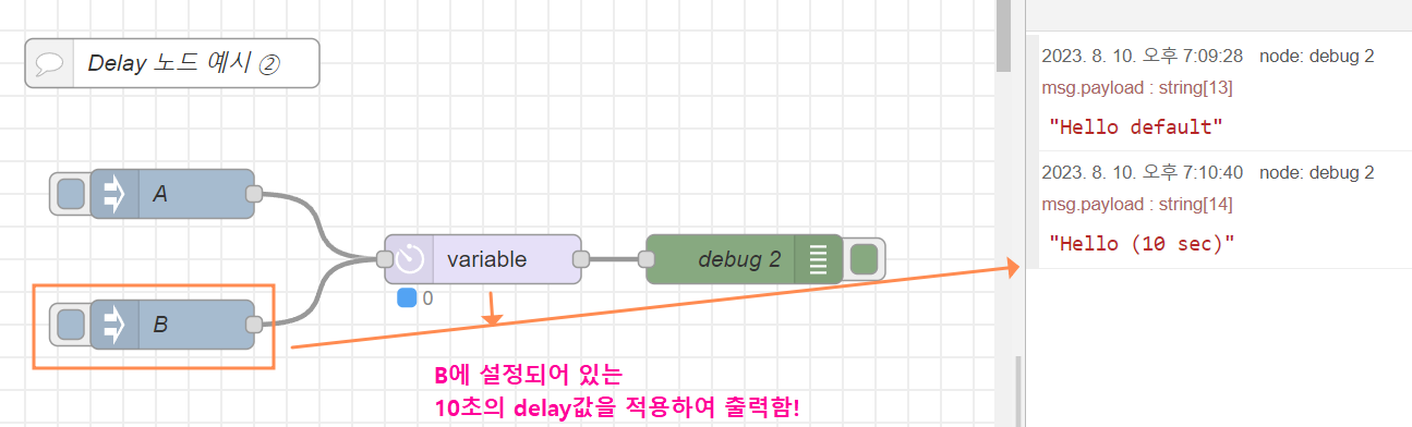 지연 전달하는 몇 가지 조건 설정을 할 수 있는데요, 예를 들어 아래처럼 5초의 시간 delay를 시켜볼 수 있습니다. 확인을 위해 1번 debug 창은 바로 연결하였고, 2번 debug 창은 5초의 시간 delay를 거치도록 하였습니다.