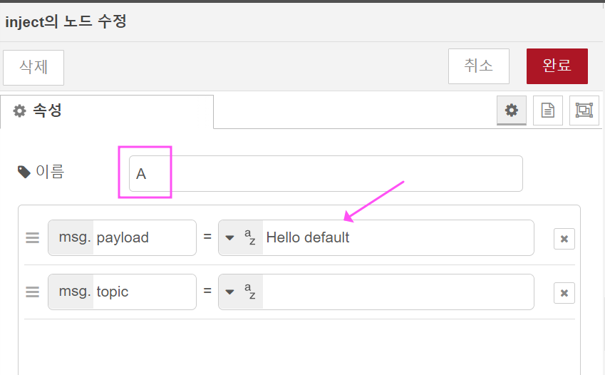 3. 'A' inject노드에는 단순한 전달 메시지만 입력합니다.