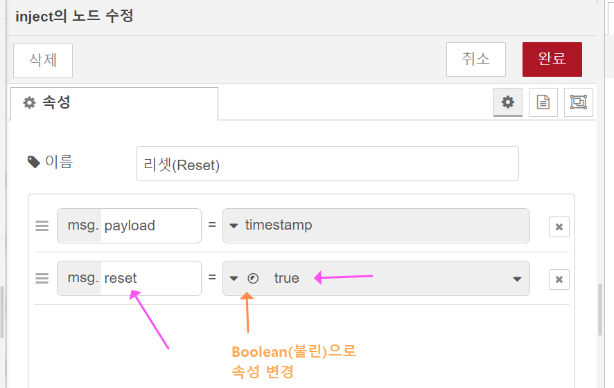 그리고 리셋(Reset) inject 노드의 속성은 아래처럼 합니다. 일반 inject 노드를 추가해서 두 번째 줄에 있는 msg.topic 항목의 topic 글자를 지우고 reset를 입력합니다.(자동완성 기능 제공) 그리고 속성창에 있는 속성을 Boolean(불린)으로 변경하고, true값으로 설정 확인해 주면 됩니다.