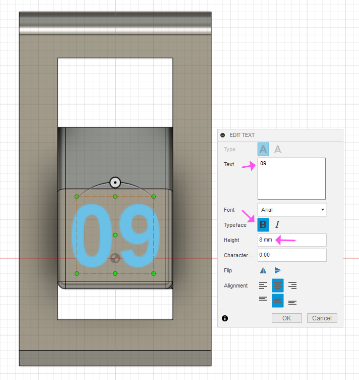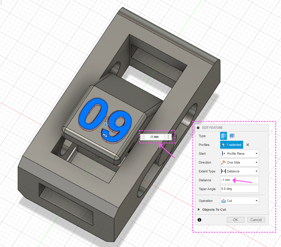 숫자를 넣는 위치의 부품 두께가 아주 얇은 것이 아니라면, 기본적으로 음각은 -1mm 이상 주는 것이 좋습니다.