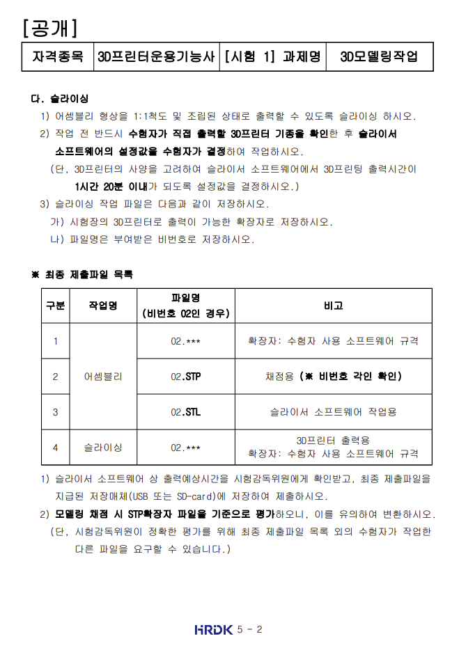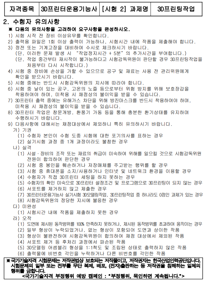 ( ※ 출력물 출력 시간 : 1시간 20분 이하이며, 슬라이서 툴에서 "출력 예상 시간"이 1시간 20분 이하로 슬라이싱 된 것을 감독관으로부터 확인을 받아야 2 과제로 넘어올 수 있음)