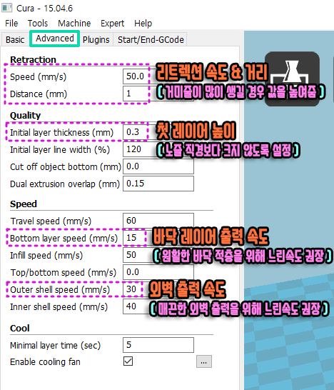 큐라 15.xx 버전의 슬라이서 프로그램을 예시로 주요 설정 사항을 체크해 보세요.