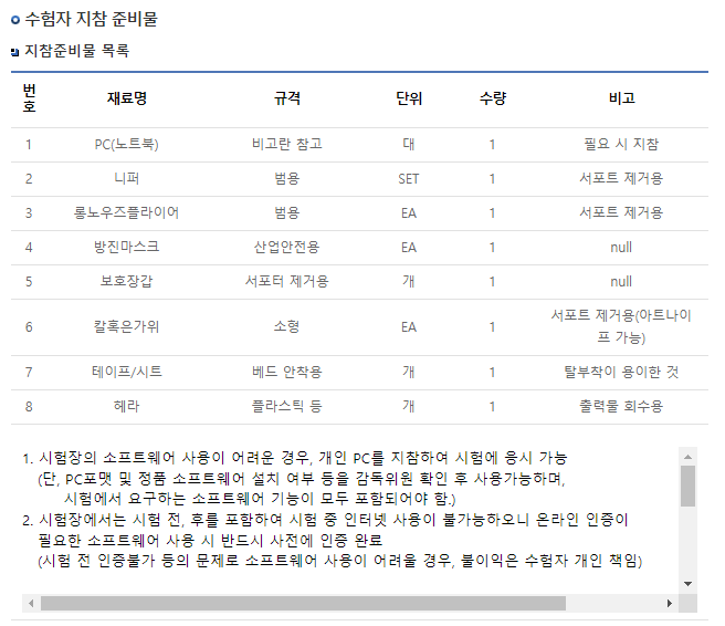 수험자 지참물은 반드시 사전에 꼼꼼하게 챙겨서 가야합니다. 시험장에 따라, 특히 보호장갑이나 방진마스크 등 일부 지참물을 준비해 가지 않을 경우 감점처리 될 수 있습니다. 특히 안전과 관련된 지참물의 경우, 예를 들어 장갑을 끼지 않고 서포트 제거하다 손을 다치거나 할 경우 책임의 소재도 있기 때문이기도 하겠지만, 실제로 날카로운 공구를 가지고 작업할 때 손을 다치는 경우가 종종 있기 때문에 본인을 위해서라도 지참물을 잘 챙겨가시기 바랍니다.