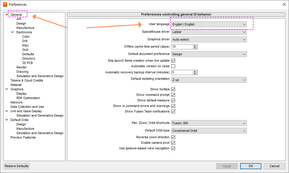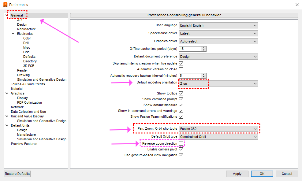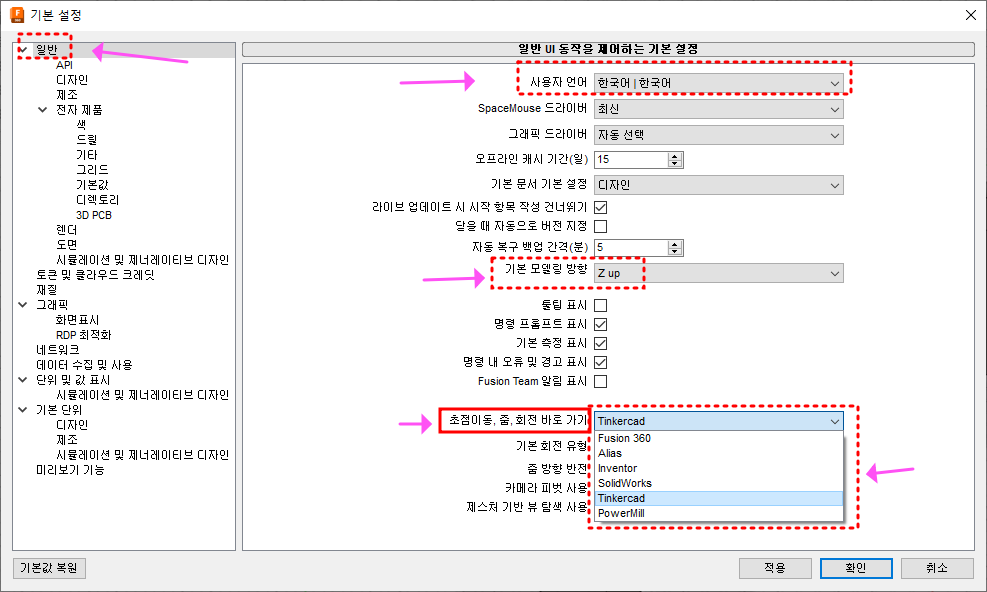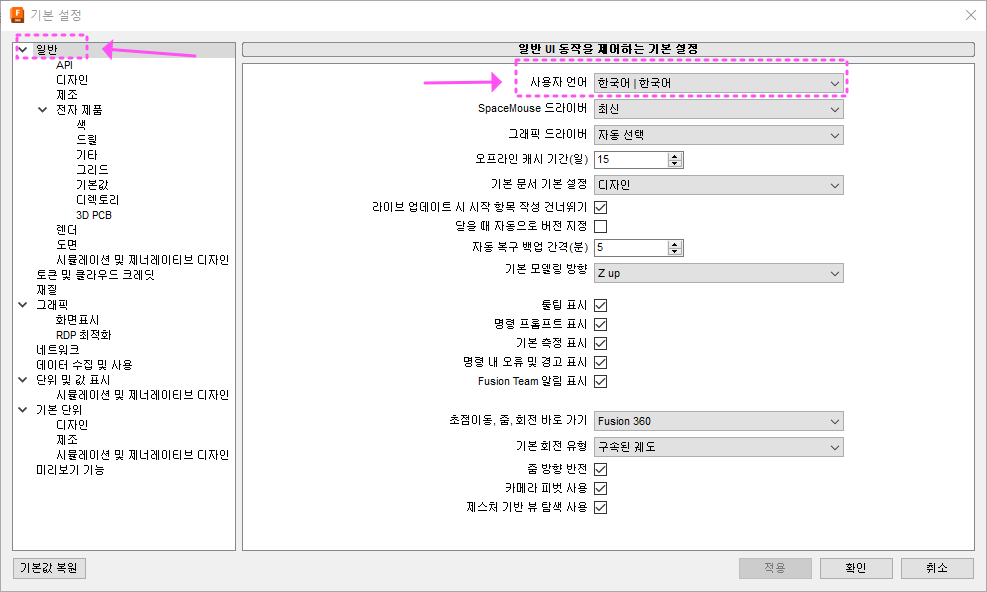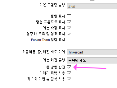3) 자신이 사용하는 Fusion360 사용자 환경설정 다시 확인하고 가기!