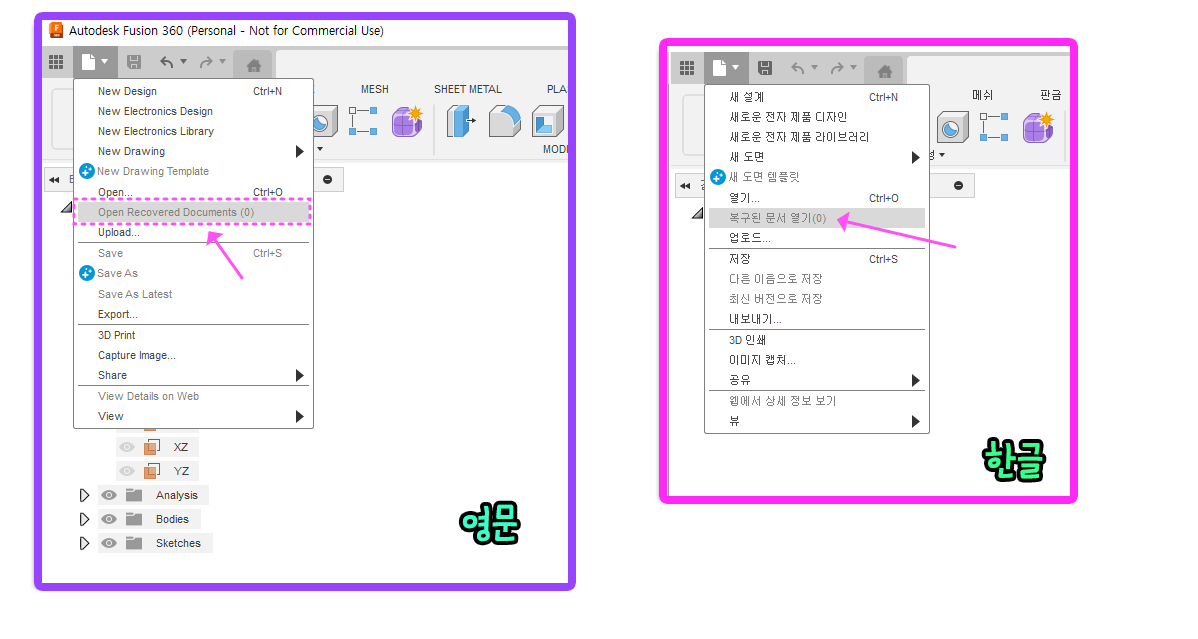 또한, 아래에 보이는 작업파일 복구하기 기능도 알아두면 좋습니다. 작업 중 갑자기 다운되거나 할 경우 프로그램에 설정된 일정 간격 자동 저장 기능으로 저장된 파일을 불러올 수 있는데요, "Open Recovered Documents(0)" 메뉴를 통해 복구할 수 있습니다. (한글 모드에서는 "복구된 문서 열기(0)"로 표시됩니다)