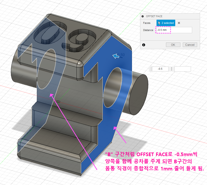 아래 이미지에서 "A" 구간처럼 원통형의 경우 OFFSET FACE로 -0.5mm로 공차를 주면 원직경으로 딱 -1mm 줄어들게 됩니다.