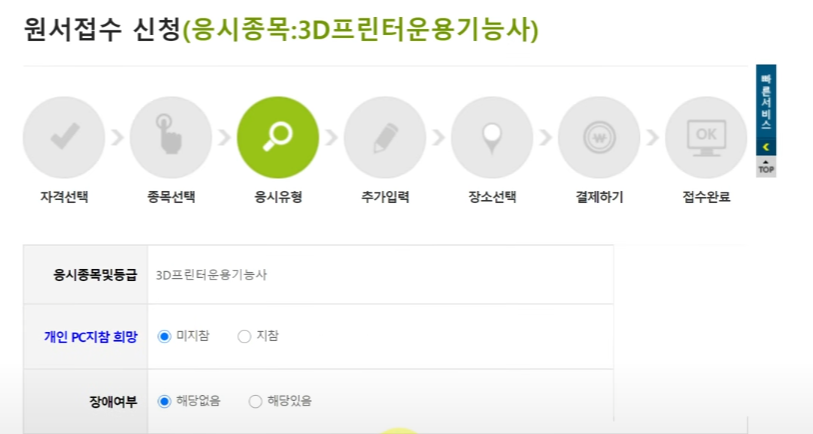 여기서 중요한 건, 필기 접수때도 마찬가지지만 실기 접수는 더더욱 자신이 연습한 모델링툴이 정해져 있고, 사용하고자 하는 슬라이서 툴 및 선호하는 3D 프린터 기종이 별도로 있기 때문에, 이런 조건들을 모두 만족하는 시험장에서 시험 볼 수 있도록 실기시험 접수 때 상당히 신경 써야 합니다. 접수 기간은 며칠 여유가 있는 것은 사실이나 자신이 사는 지역과 되도록 가까운 지역으로 시험장을 선택하고자 한다면, 그리고 자신이 원하는 장비와 소프트웨어가 갖춰진 시험장이 조기에 인원마감이 될 수 있기 때문에 접수 당일 오픈 시간(오전 10시) 전에 준비해서 바로 접수할 수 있도록 하는 것이 좋습니다.