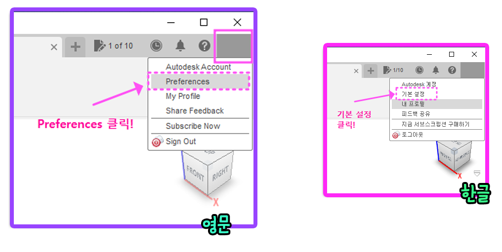 자신이 사용하던 Fusion360의 언어 설정과 시험장의 언어설정이 다를 수 있습니다. 따라서 자신이 원하는 언어로 변경이 필요한데요,