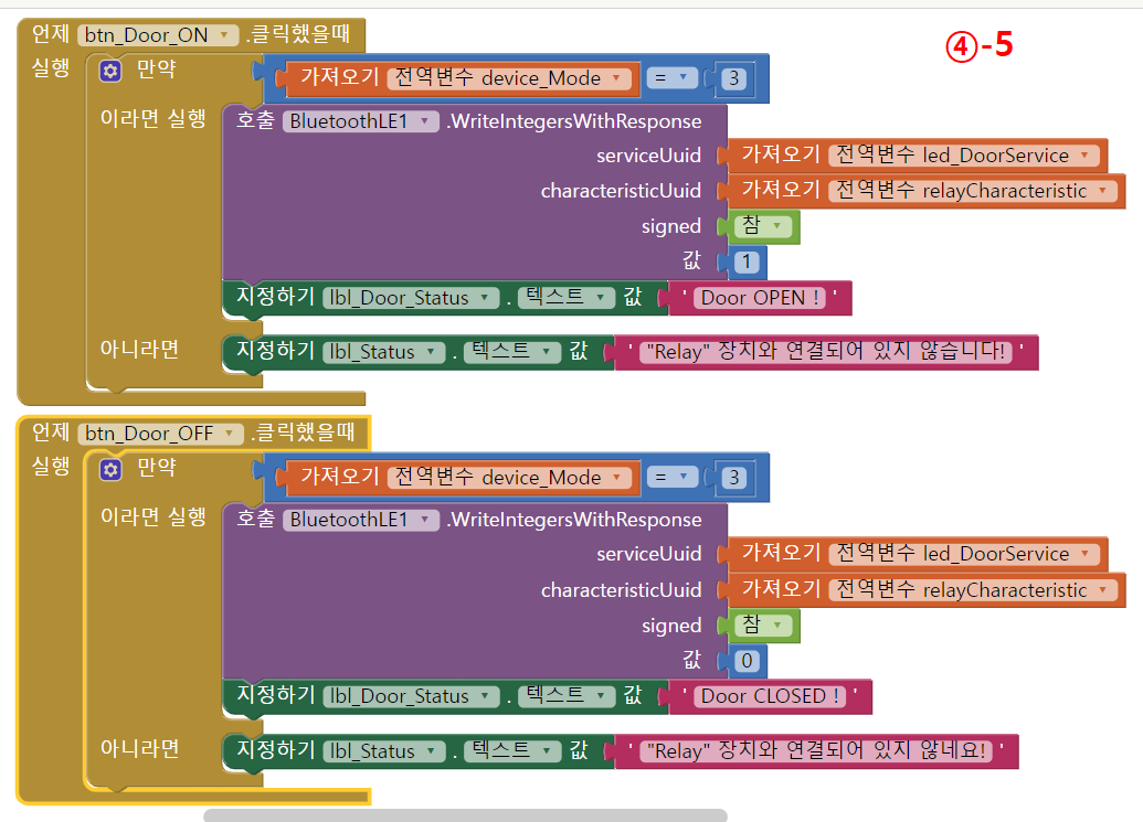 Door Scan 버튼을 통해 device_Mode 변수값이 3인지 확인해서 Relay에 할당된 특성UUID 값을 가져오도록하여,