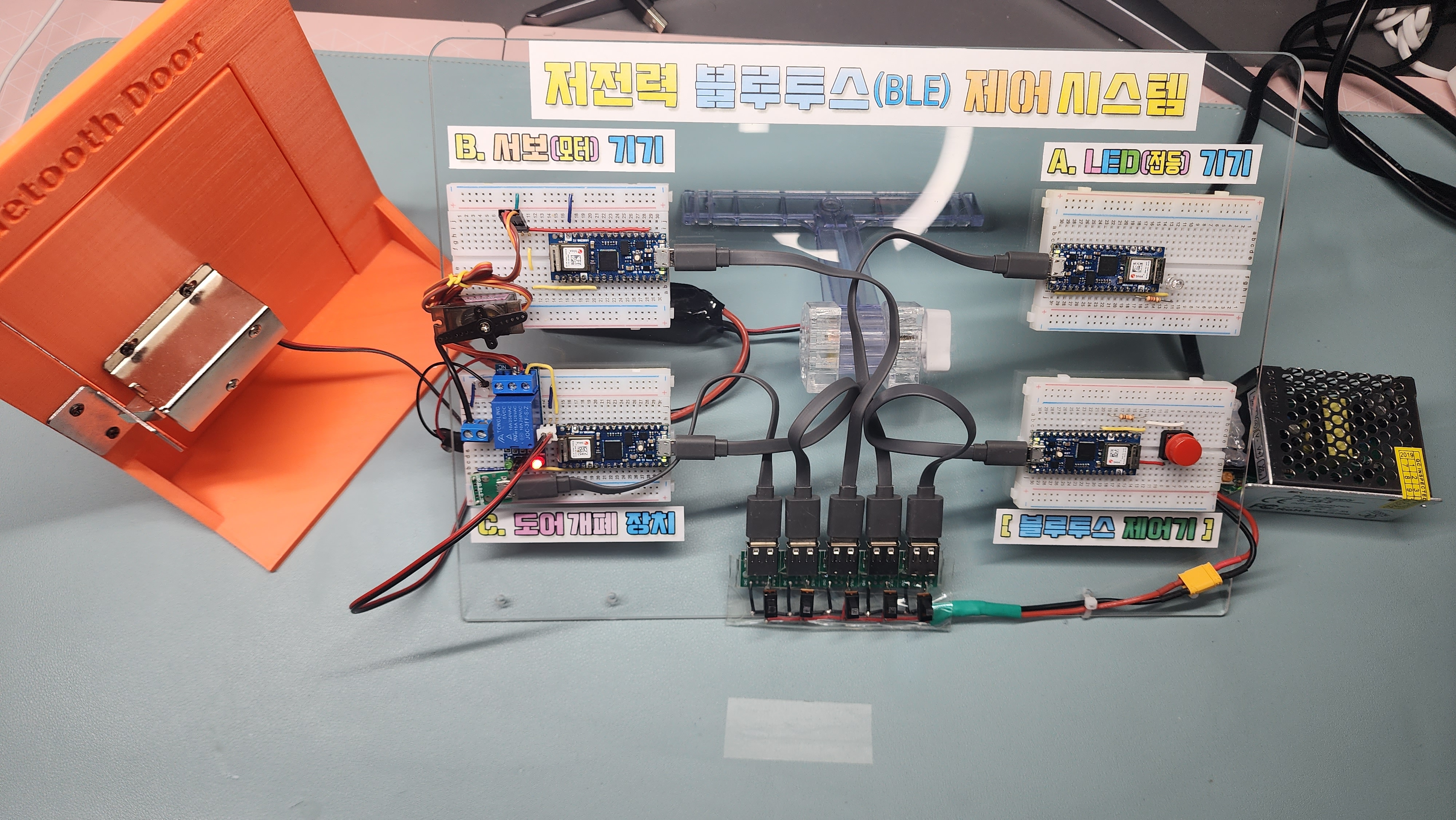실습을 위한 회로들을 아래처럼 아크릴 판(투명 아크릴 독서대 활용)을 이용해서 정리해 보았는데요, 특히 5V 전원이 다중으로 들어가기 때문에 5V 5A 용량의 미니 파워서플라이를 이용해서 USB 다중 전원 잭을 만들고 공급해 주었습니다.