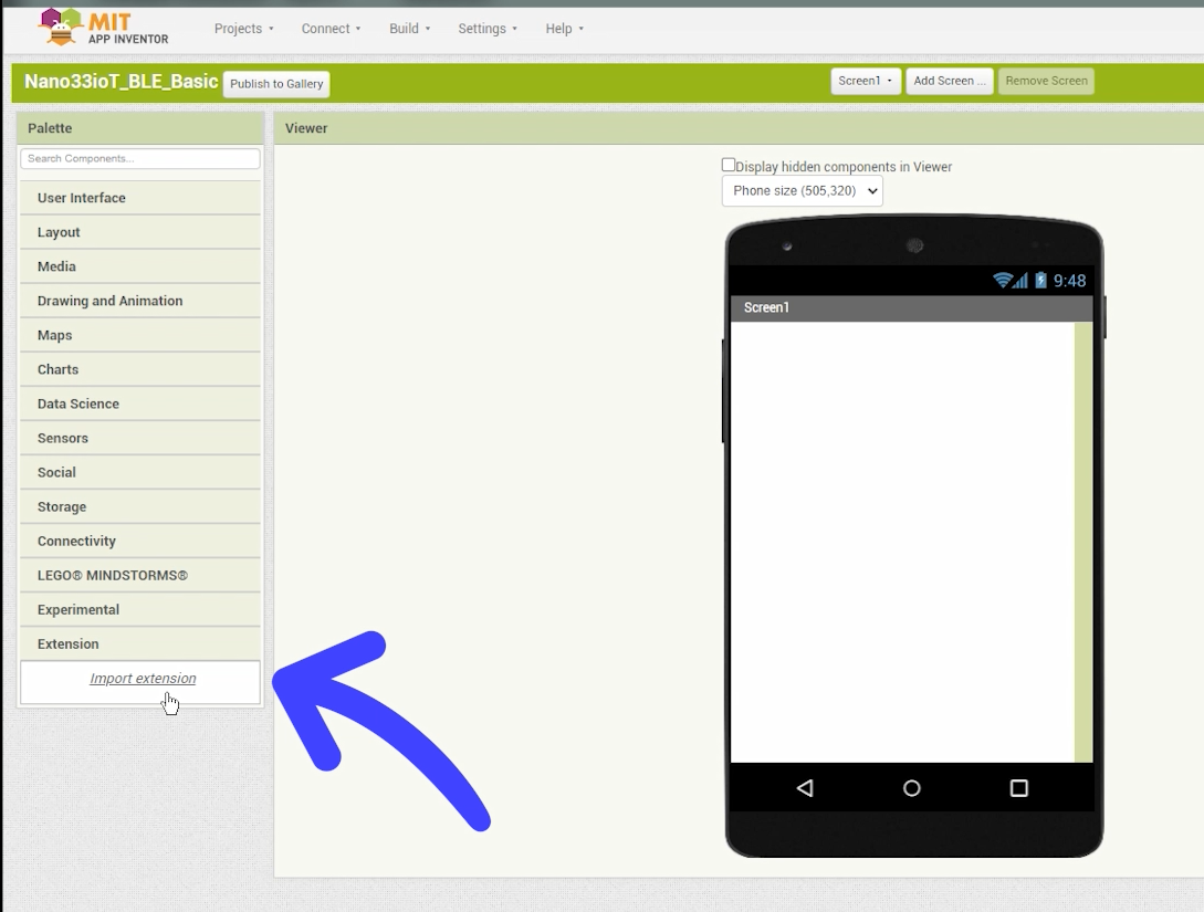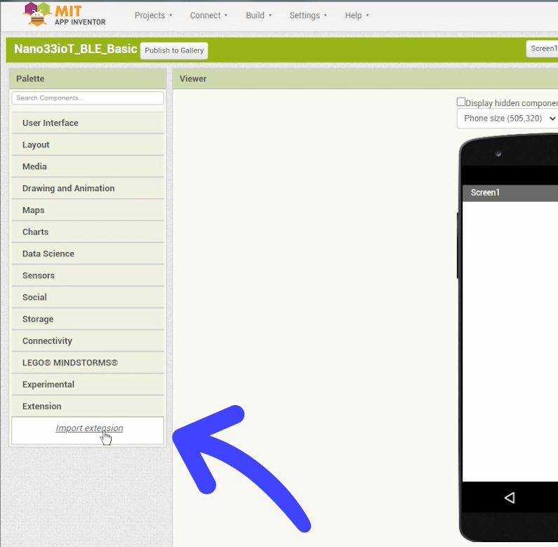하지만 여기서는 저전력 블루투스(Bluetooth LE)를 사용해야 하기 때문에 BLE 확장 패키지를 Extension항목에 별도로 추가해야 사용할 수 있습니다.(아래)