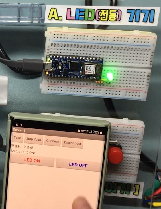 여기까지 Nano33 ioT 보드에서 제공되는 저전력 블루투스(BLE) 기능을 이용한 제어 시스템 학습 안내를 마무리하도록 하겠습니다.