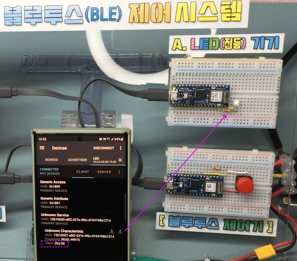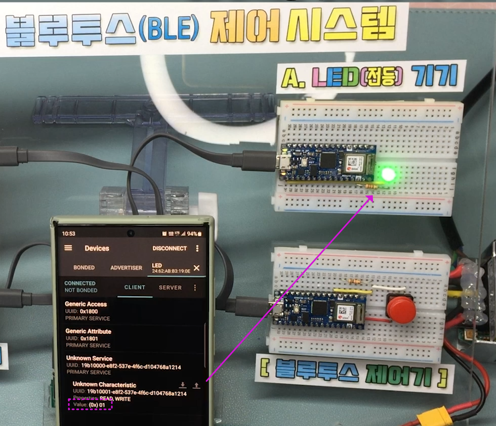 각 버튼에 맞도록 폰과 Nano33 ioT 기기와 페어링 되도록 하였습니다.