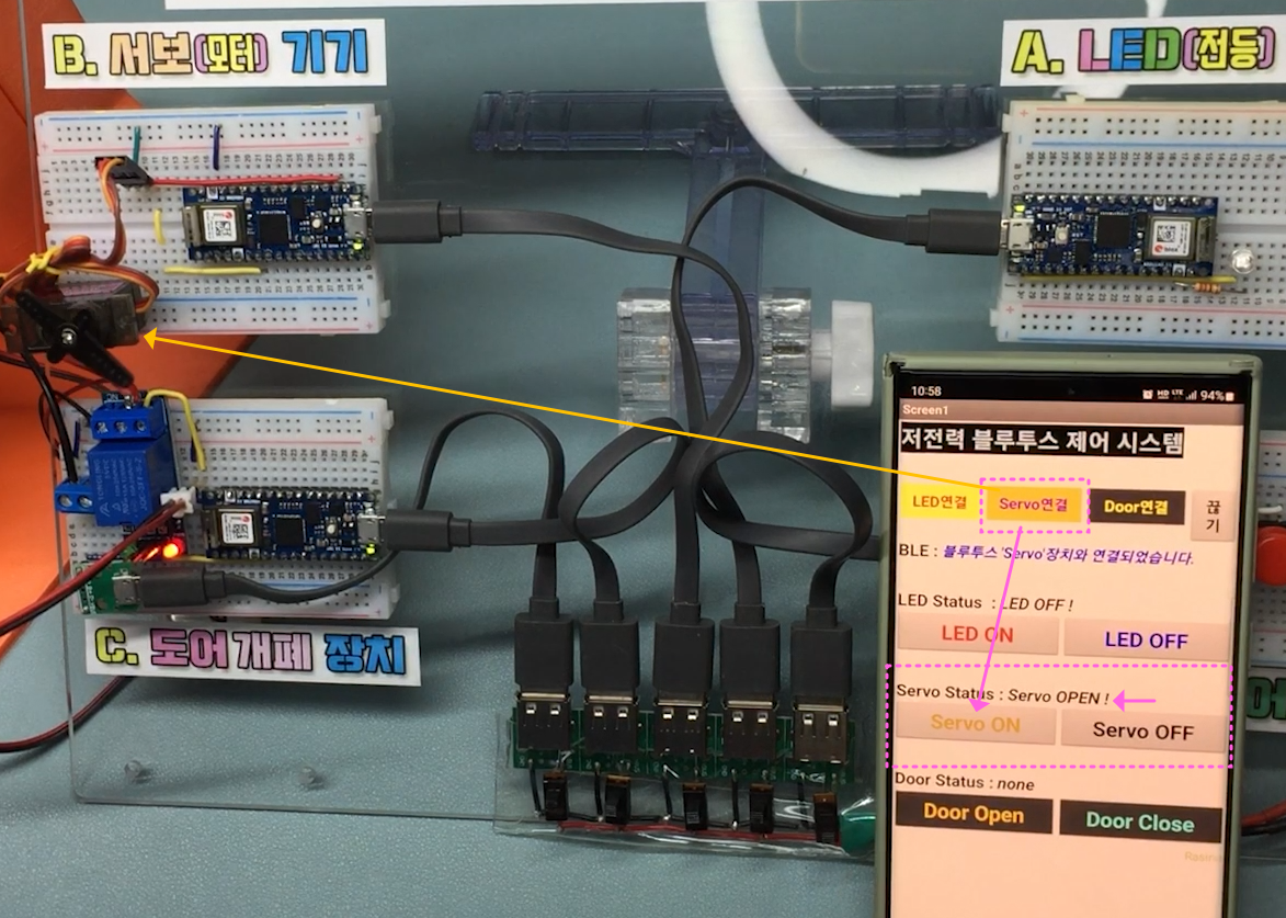① 기본적으로 블루투스는 1대 1로 연결되는 기기이기 때문에, 버튼회로(중앙회로) + LED 회로(주변회로) , 등 개별로 연결되도록 BLE의 로컬 네임을(SetLocalName) , 각각 "LED" , "SERVO" , "DOOR"로 하여 1대 1 통신하도록 하였는데요, 그럼 이렇게 번갈아가며 1대1 연결하고 통신 시연하려면, 버튼회로로 사용되는 중앙회로에 연결시키려는 기기이름으로 계속 바꾸어가며 업로드를 해야 하니 번거로워집니다. 따라서, 이 실습에서는 로컬 네임을 "MULTI"로 통일하여 주변기기의 전원을 ON / OFF 하여 간편히 페어링 되도록 하였다는 점 참고해 주세요.