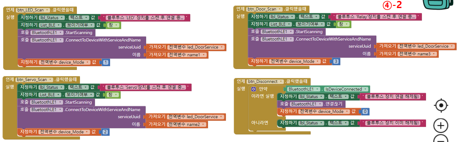 ② 중앙회로가 스마트폰이 되면 앱상에서 버튼별로 로컬네임을 줄 수 있기 때문에 각 회로별로 SetLocalName을 각각 "LED" , "SERVO" , "DOOR" 주어 구분할 수 있고 그렇게 해야 원하는 기기를 선택해서 페어링 할 수 있습니다. 따라서 이렇게 네이밍이 된 코드는 아래에 압축하여 제공해 드립니다.