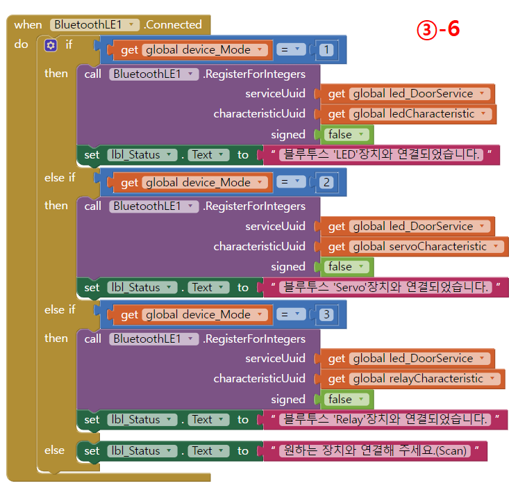 아래 블록코딩은 장치 선택에 따라서 블루투스 UUID 특성값을 다르게 선택하도록 처리한 부분입니다.