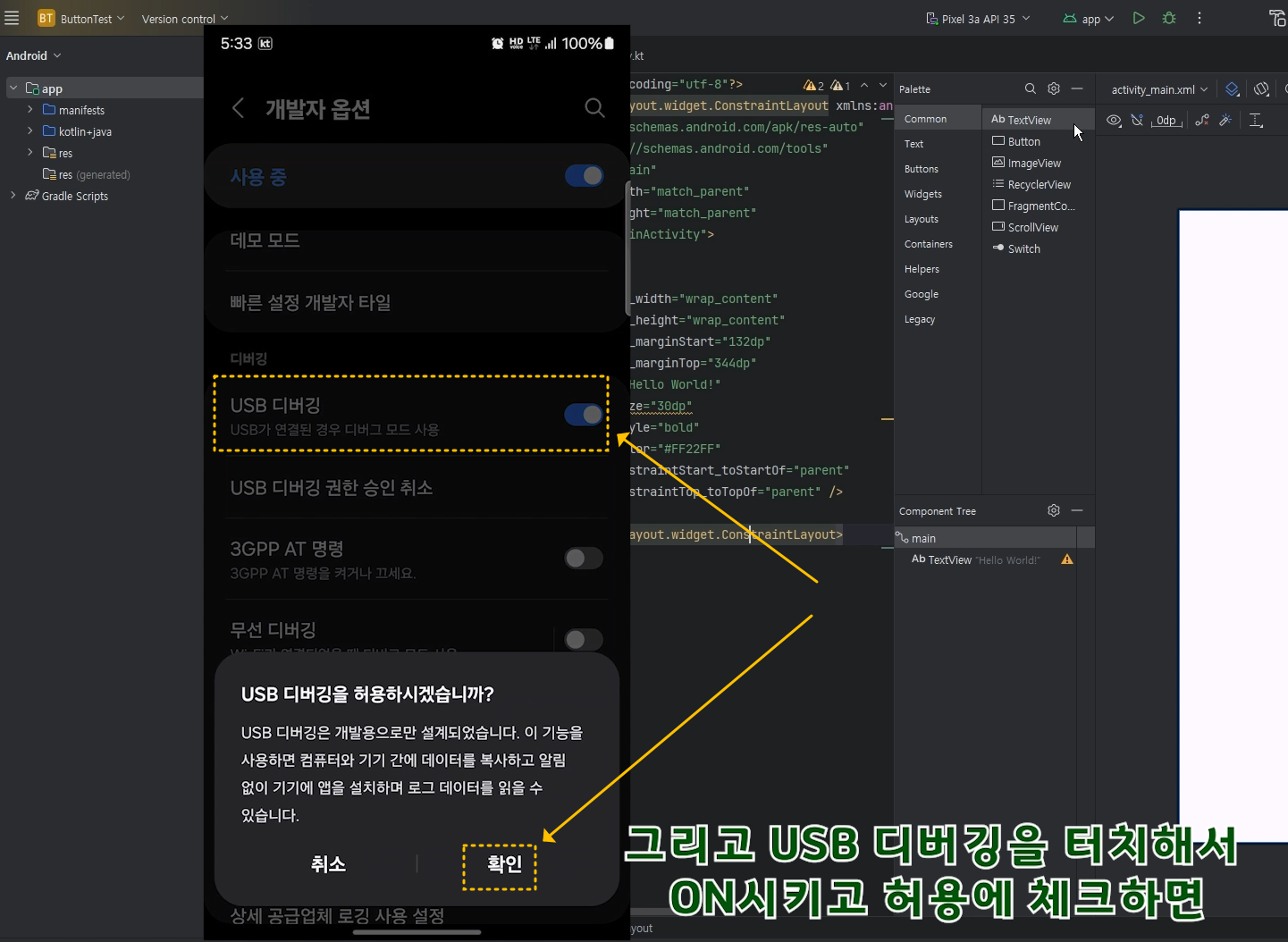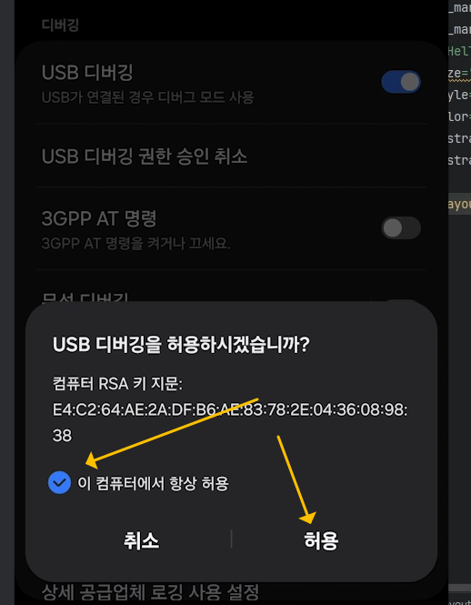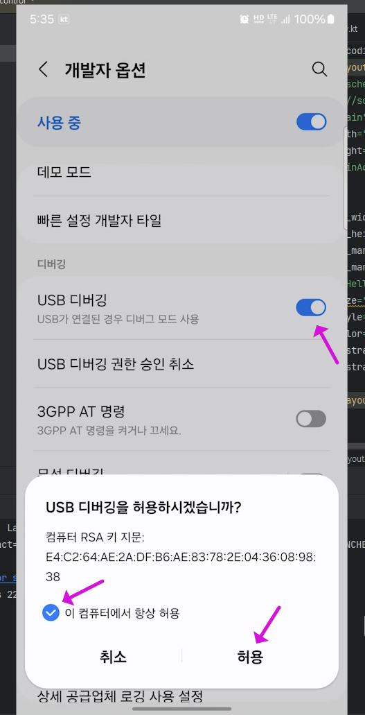그럼 다시 "이 컴퓨터에서 항상 허용"에 체크해 주고 확인을 눌러 주면 USB 디버깅이 활성화된 것을 볼 수 있습니다.