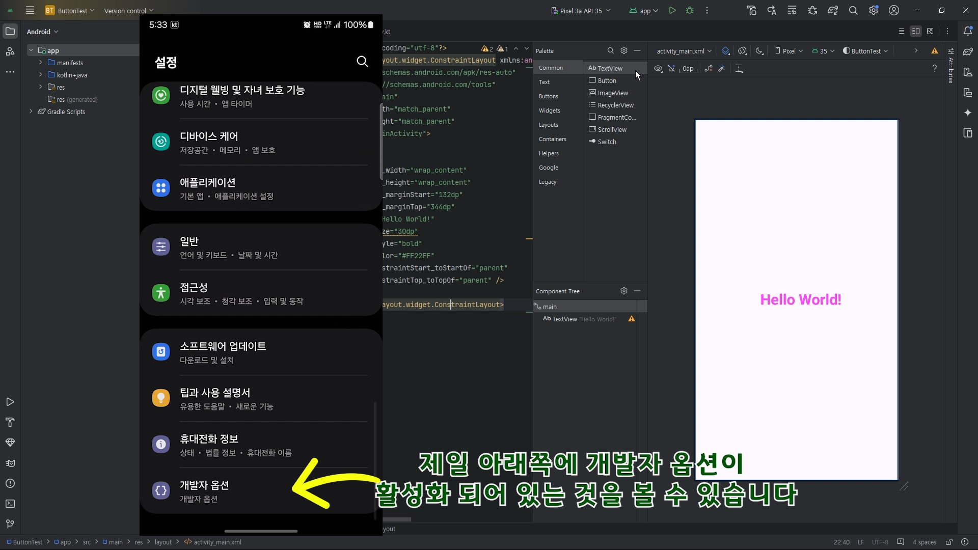 그럼, 뒤로 가기를 한 번 눌러 제일 아래로 스크롤해 보면, 아래처럼 '개발자 옵션'이 활성화되어 있는 것을 볼 수 있어요.