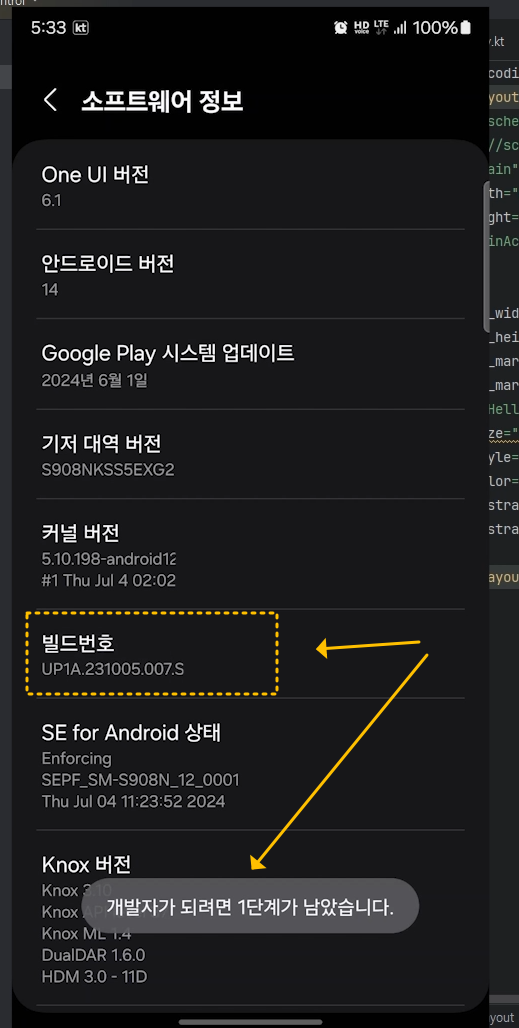 다음, '빌드번호'를 7회 이상 터치해 주면, 개발자 메뉴가 활성화됩니다.