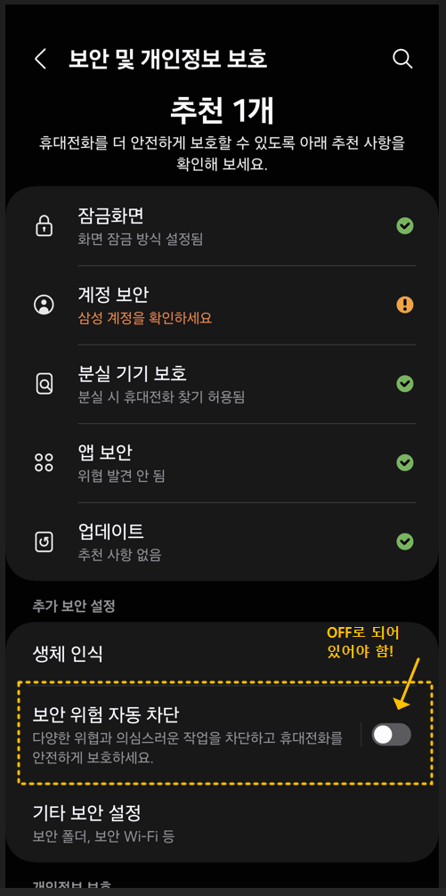 아레 폰에 보안 설정을 ON 하면 USB 디버깅 메뉴가 계속 꺼져있게 됩니다.