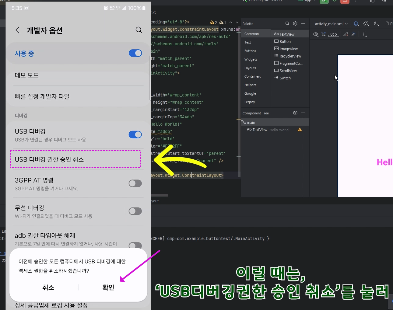USB 디버깅 메뉴를 터치해서 USB디버깅 허용 팝업창의 확인 버튼을 터치하고,