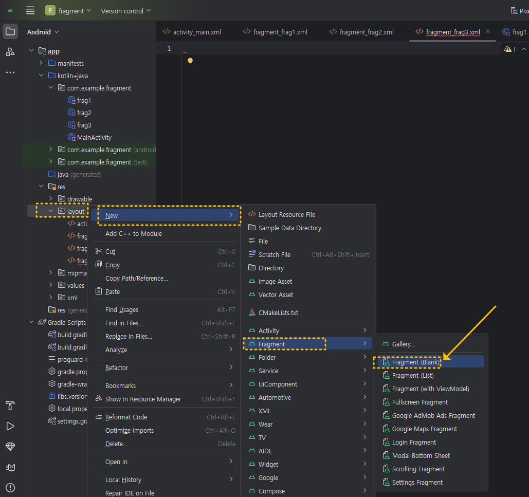 ② 아래 이미지를 참고하여 res 》 layout 》 New 》 Fragment 》 Fragment(Blank) 를 클릭하고 타이틀은 frag1으로 입력하여 만들면 fragment_frag1.xml 파일과 함께 frg1.kt 파일이 세트로 만들어집니다. (layout에서 마우스 우클릭하면 New 메뉴가 나타납니다)