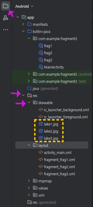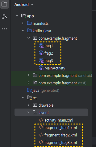 같은 방법으로 아래 이미지처럼 fragment_frag2.xml , fragment_frag3.xml ( frg2.kt , frag3.kt)을 만들어 주세요.