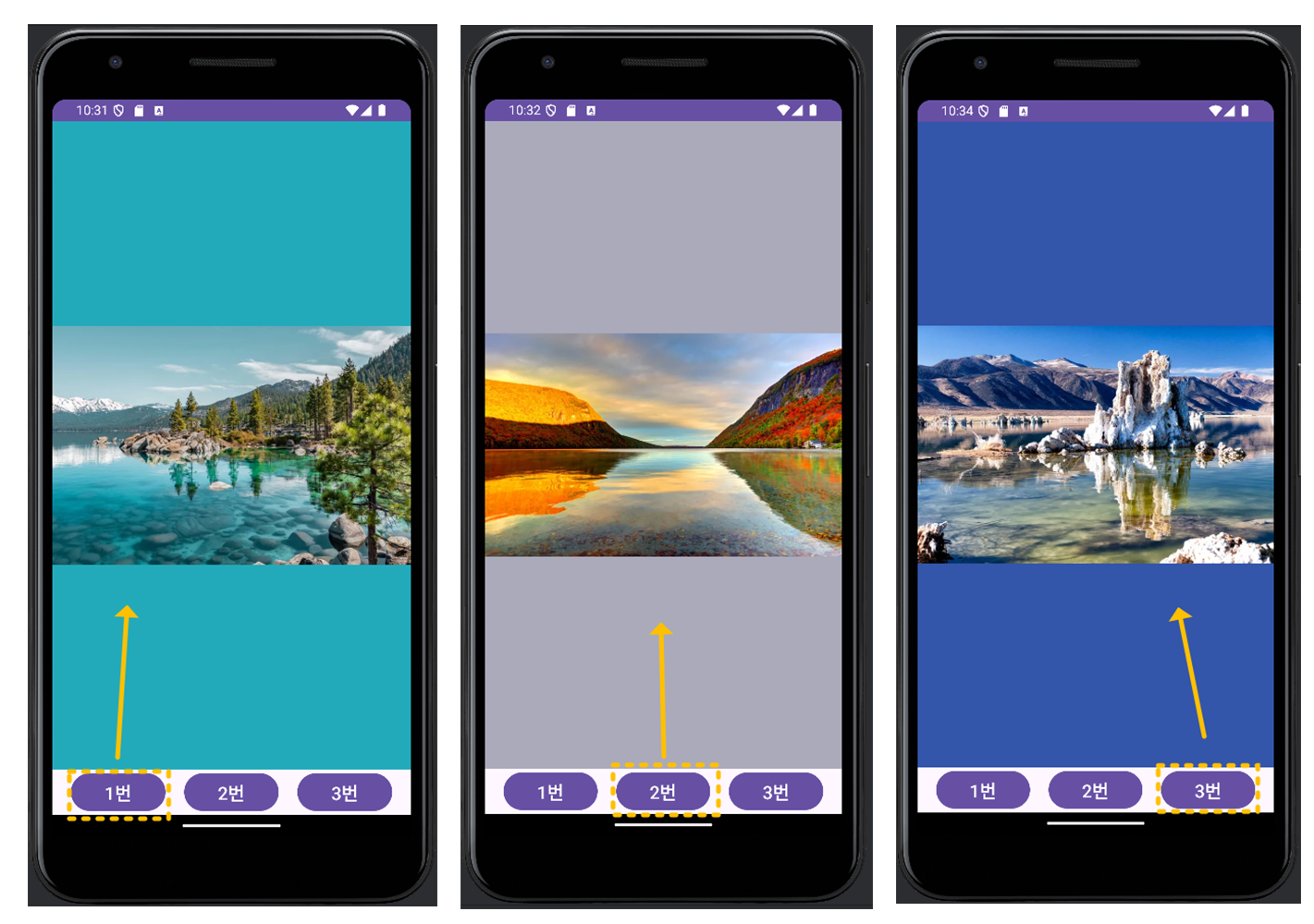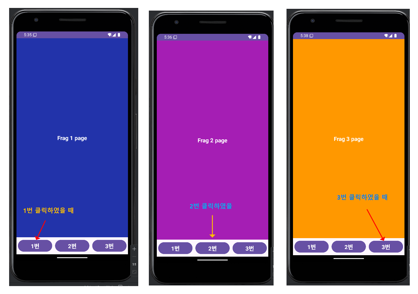 → 1번, 2번, 3번 버튼을 클릭하면 아래와 같이 main_activity.xml 레이아웃 화면에 각각의 프래그먼트 화면이 로딩되도록 합니다.
