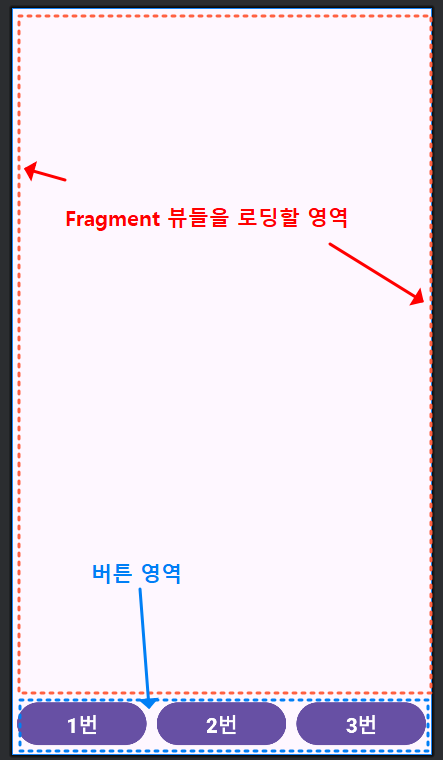 → 3개의 버튼과 3개의 프래그먼트 화면을 각각 만들고 각 버튼들을 클릭하면 각각의 프래그먼트 화면이 로딩 되도록 합니다. 이때 메인 레이아웃(activity_main.xml) 화면에는 FrameLayout을 이용하여 화면을 fragment를 로딩할 View 영역과 버튼을 클릭할 영역으로 구분해서 만들어 봅니다.