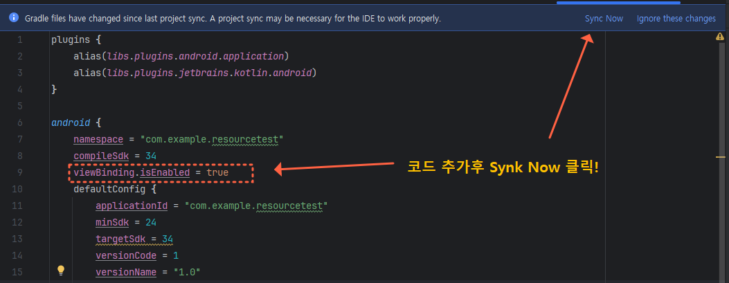 ① 먼저 gradle에 있는 build.gradle.kts(Module :app) 파일에 아래처럼 뷰바인딩 사용 선언을 해주세요.
