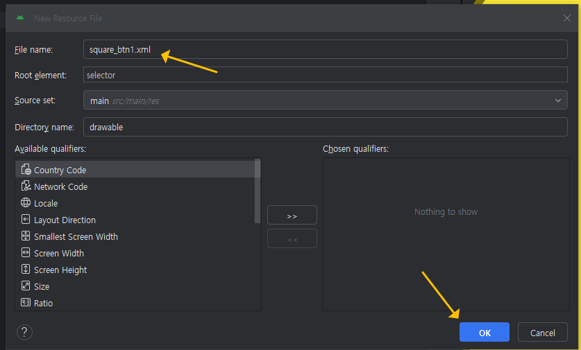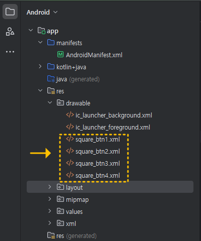 연속해서 square_btn4.xml 까지 총 4개의 파일을 추가해 주세요. (아래 참고)