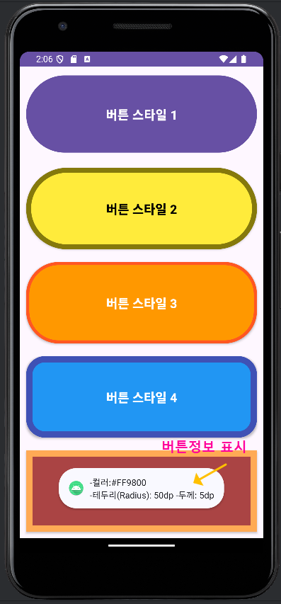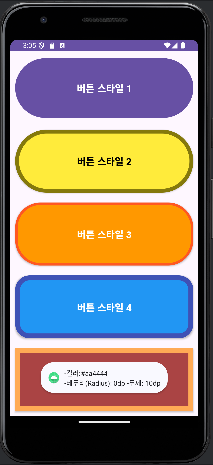 각각을 버튼으로 만들었으니, 각각의 버튼을 클릭할 때마다 각 버튼의 컬러 코드와, 테두리(Radius) 반지름 값과, 두께를 Toast 함수를 이용해서 메시지로 표시하도록 하였습니다.
