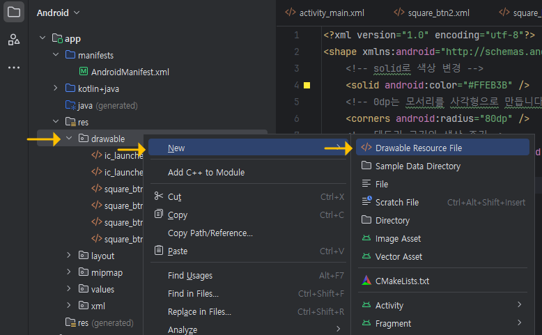 파일 이름은 square_btn1.xml 로 할게요.