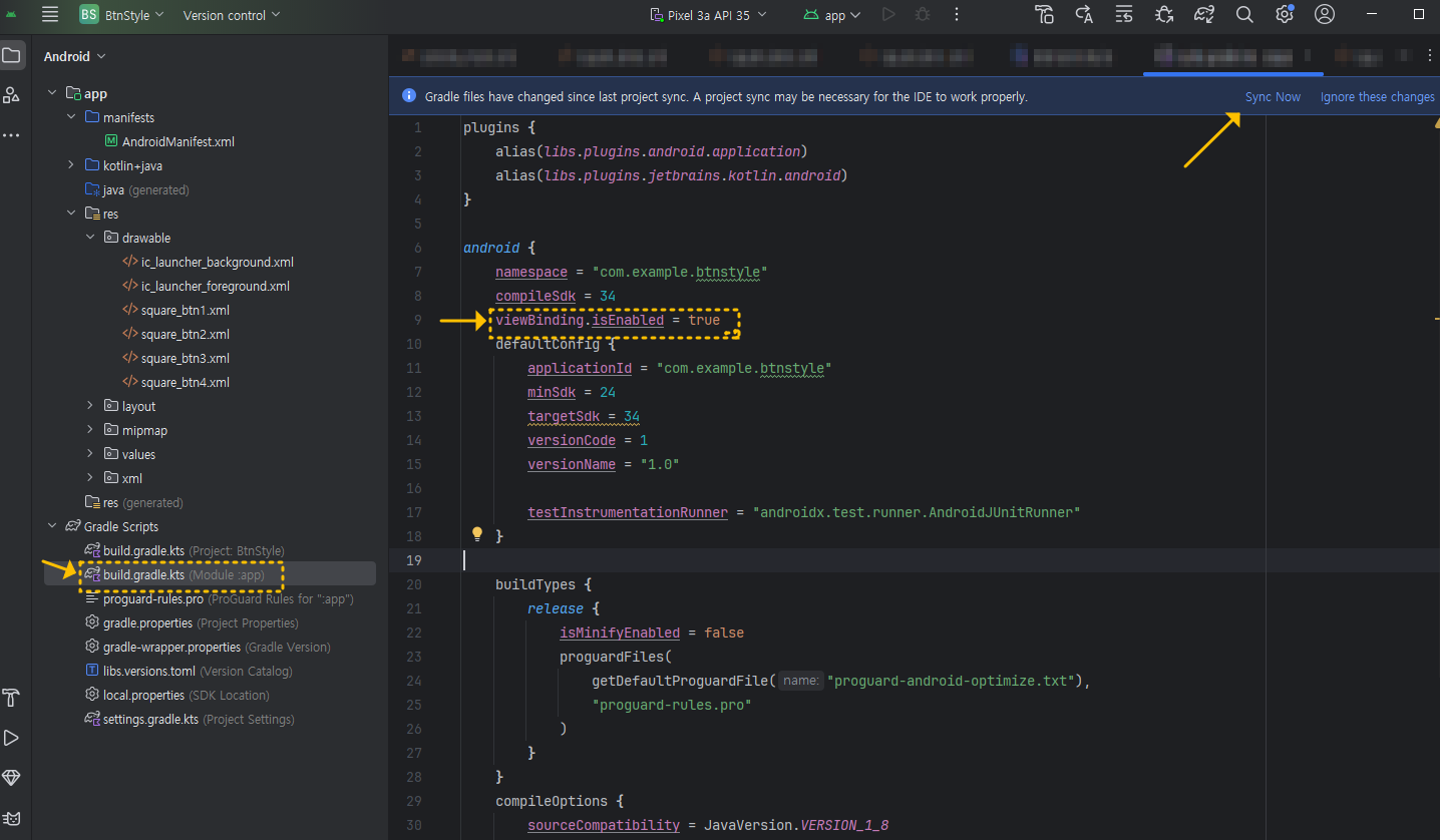 - 그래들 항목에서 build.gradle.kts (Module :app)로 들어가서 viewBinding.isEnabled = true를 추가하고 Sync Now를 적용해 주세요.