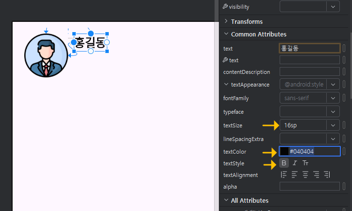 다음, text 속성에서 textSize = 16sp , textColor = #040404 , textStyle = Bold로 변경합니다.