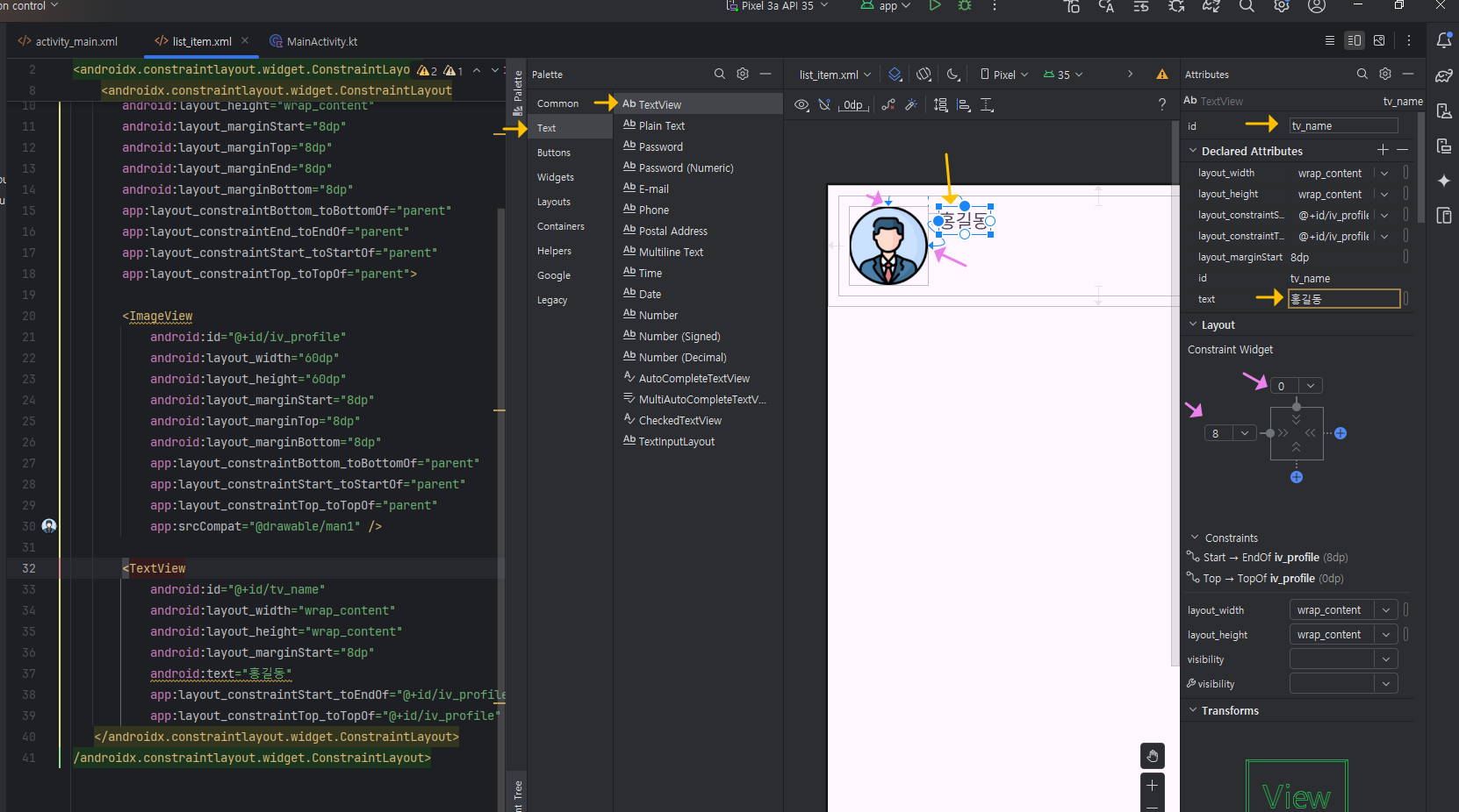 ① 텍스트뷰를 끌어다 놓고, id = tv_name , text = 홍길동 입력하고, 아래처럼 Constraint Widget의 연결을 해주세요.