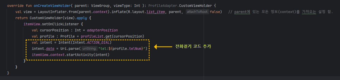 ProfileAdapter.kt 파일을 열고, onCreateViewHolder ( ) 함수 부분을 아래와 같이 수정(추가) 해 주세요.