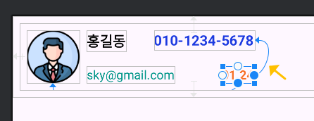또는 이름의 오른쪽과 연결시킨 부분을 사진의 왼쪽 부분으로 바꾸어 연결시키고 간격을 90sp로 적정하게 벌어지도록 하면, 이름의 길이에 따라 전화번호가 앞뒤는 움직이는 일은 없어서 깔끔하게 정렬된 출력을 볼 수 있어요.